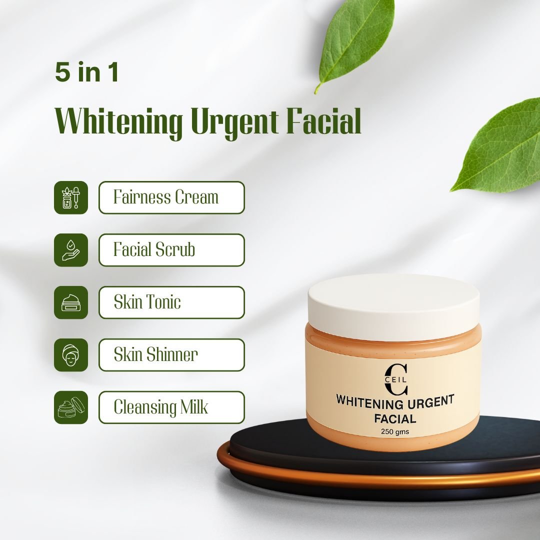 Whitening Urgent Facial 5 in 1 brightens, cleanses, and nourishes skin instantly. Includes fairness cream, facial scrub, skin tonic, skin shinner and cleansing milk for urgent glow, fairness, and smooth radiant skin anytime.